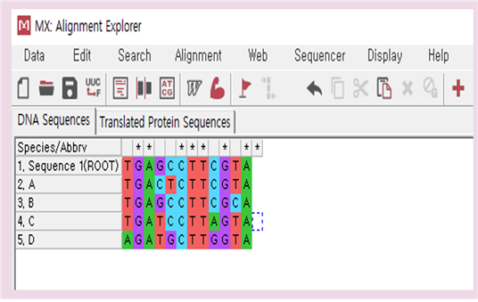 4) 그 후에 당신은 가계도를 그릴 수 있습니다. 문제가 생긴 DNS 염기서열의 유사성만을 고려했다고 하였으니 이웃결합법을 사용할 수 있다.. NJ(Neighbor Joining) 방법을 이용하여 계통수를 그리면 다음과 같은 그림이 나온다..