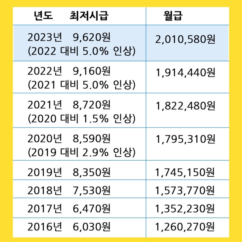 식비가 10만원에서 20만원으로 인상되면 어떻게 되는지 살펴봤습니다. 특히 근로자의 급여가 내년도 최저임금에 해당하는 경우에는 급여명세서를 작성해야 최저임금 적용이 가능하며, 2023년과 2022년에는 9620으로 결정돼 현행보다 5% 인상된다. 전년도. 하루 8시간 주 5일로 환산하면 월급은 최소 201만580원이다.